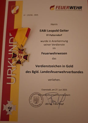 Unscheinbar und am Rande an diesem Wochenende, aber um so mehr mit großem Stolz wurde unser EABI Leopold Geiter in Anerkennung seiner Verdienste im Feuerwehrwesen vom Landesfeuerwehrverbandes Burgenland mit dem Verdienstzeichen in Gold ausgezeichnet.